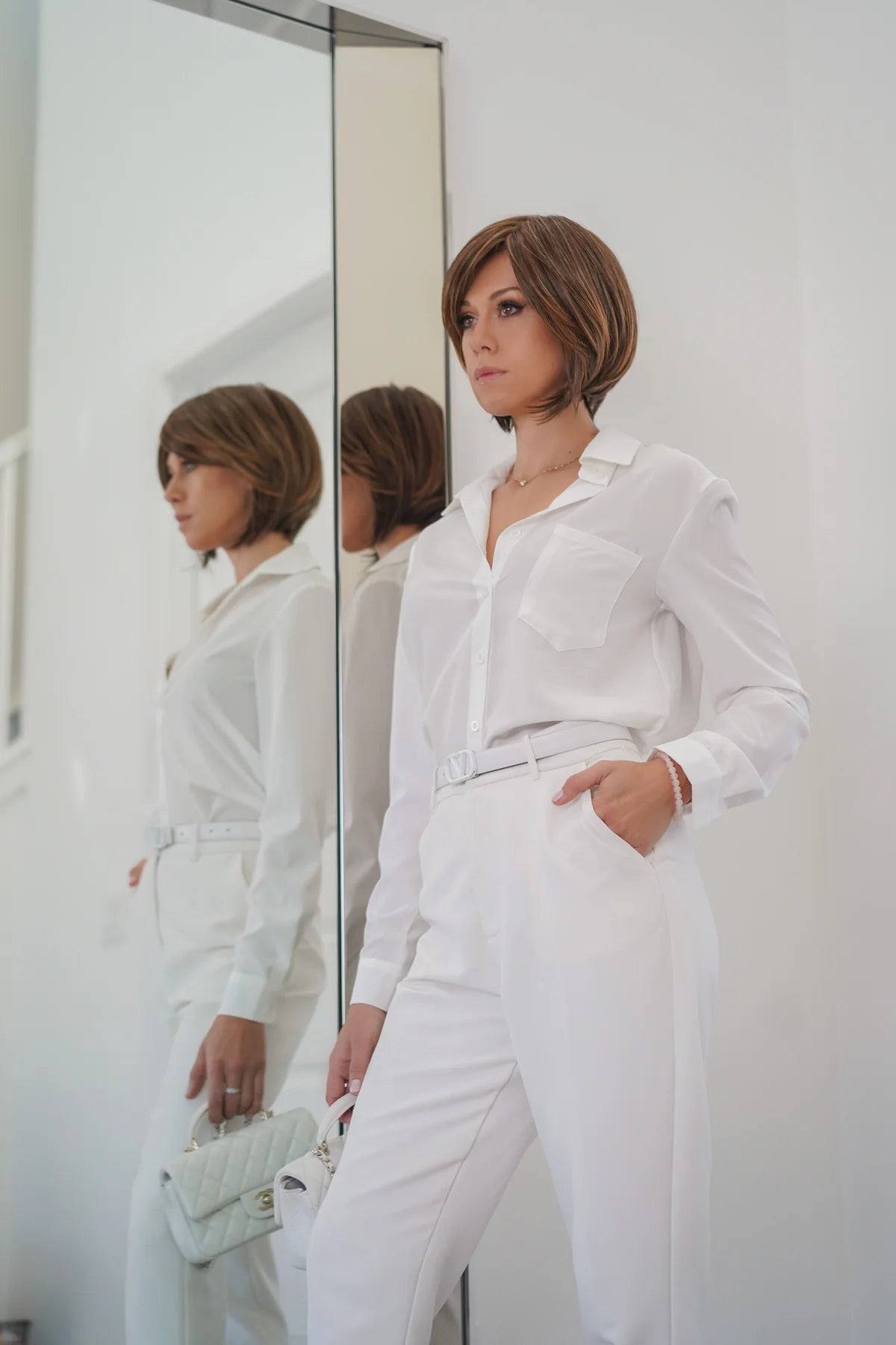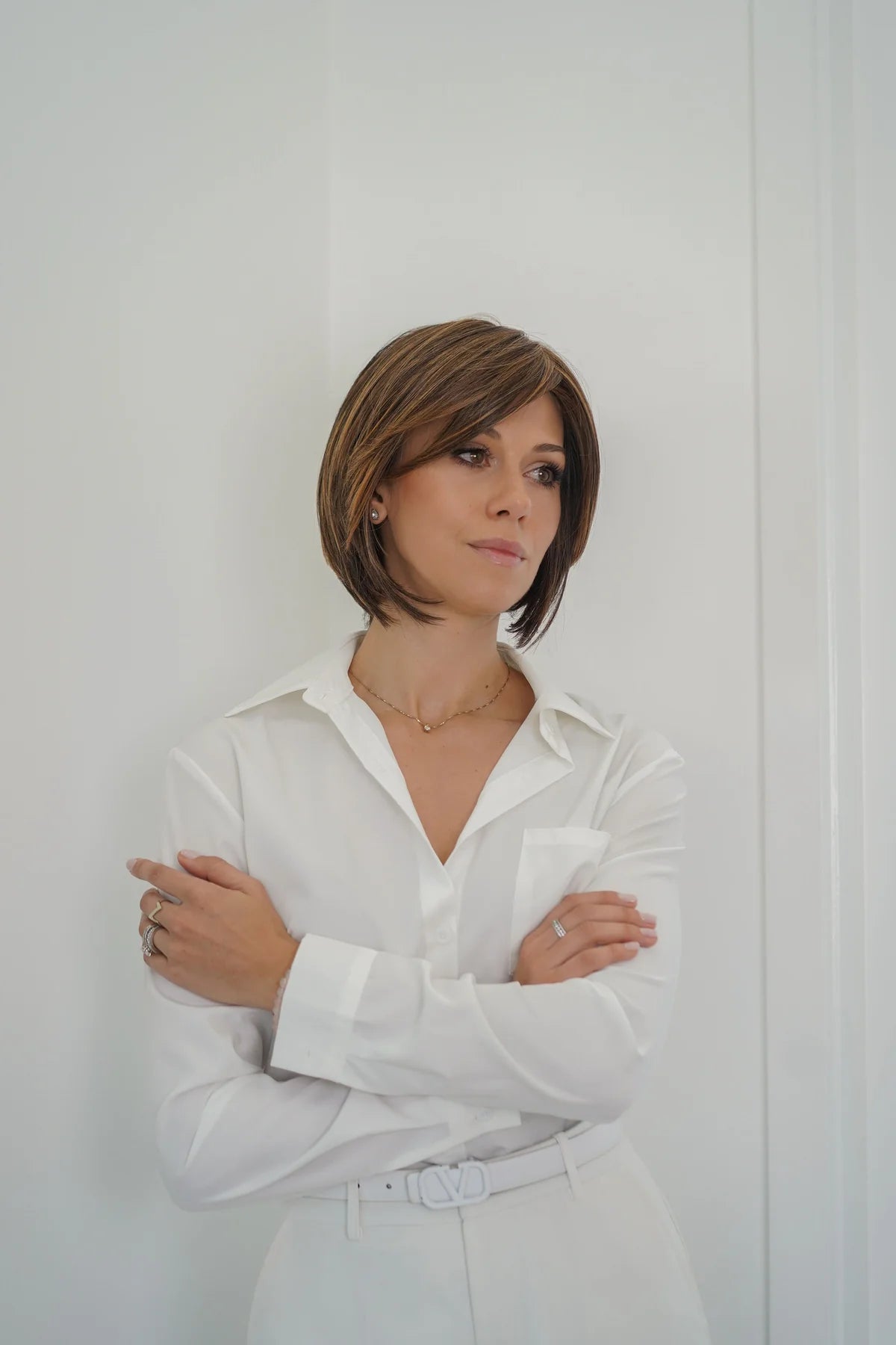 Poised wig features a chic, modern bob that falls just above the shoulders with softly layered ends that curve naturally inward, creating a polished and effortless silhouette. Its rich brown base is enhanced with warm caramel and golden highlights, adding depth and dimension that mimic natural sun-lit hair. The style includes a subtle side part and smooth, sleek texture that frames the face beautifully, giving the overall look a refined, elegant finish. It moves naturally and has a realistic hairline, making it appear sophisticated, timeless, and incredibly lifelike.